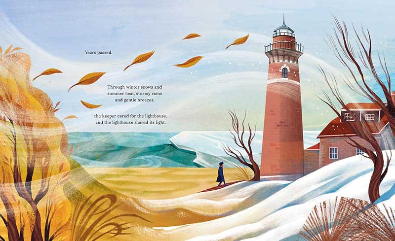 Brick by brick, a lighthouse begins to rise high into the sky beside a shimmering lake. Nestled among the sand dunes near Mears, Michigan, the new lighthouse stands 115 feet tall. The lighthouse is eager to share its light with the ships sailing on Lake Michigan. But first it needs a keeper to light its oil lamp, to ignite its spark. Soon, a keeper comes along. The lighthouse and its keeper settle into a daily routine. The keeper sweeps away the sand that sifts in. He cleans the windows. And every night, the keeper climbs to the top of the lighthouse to light the oil lamp, sharing its light with the ships sailing on the lake. When the keeper can’t continue his duties, a new keeper arrives. And then another and another as the years go by.